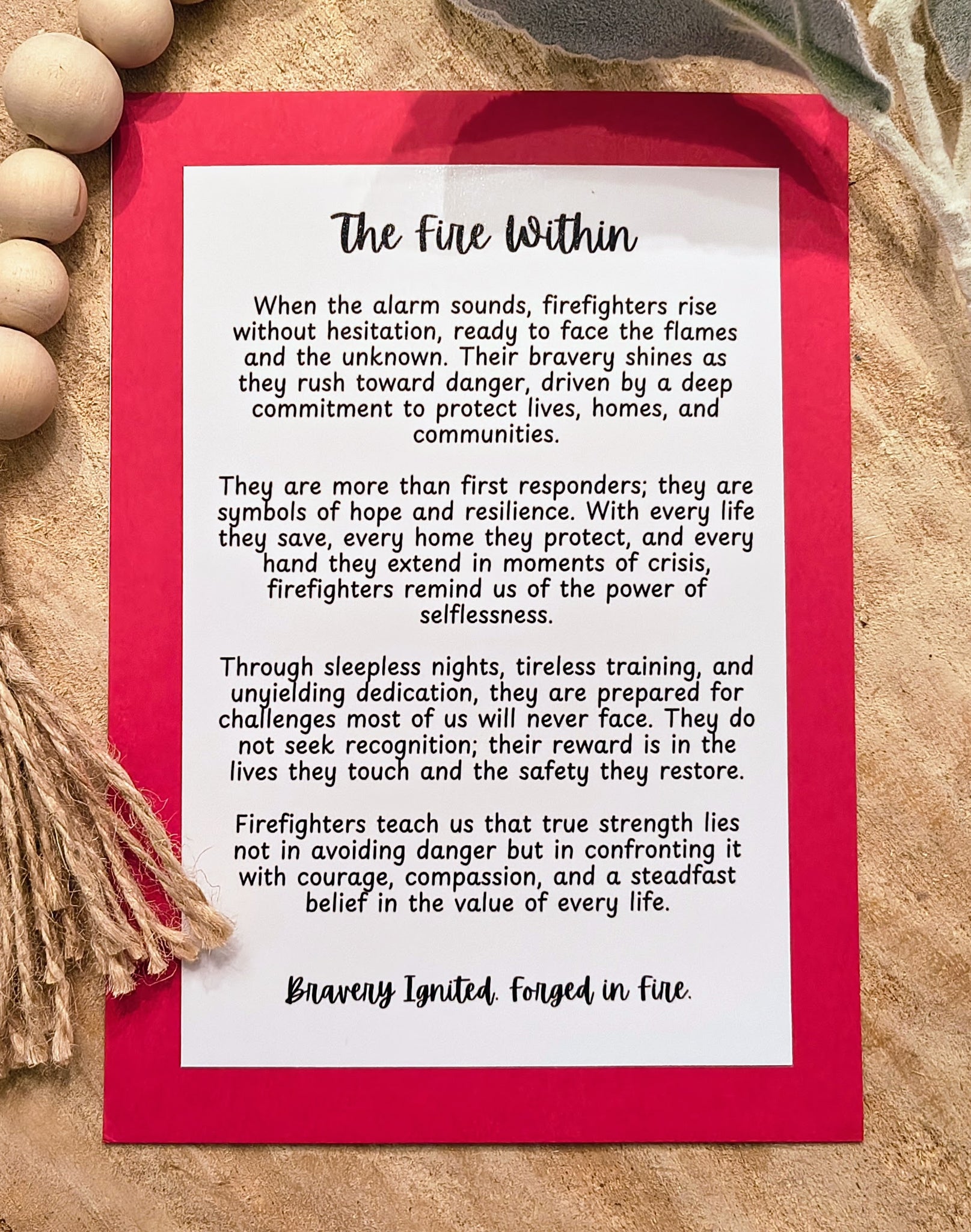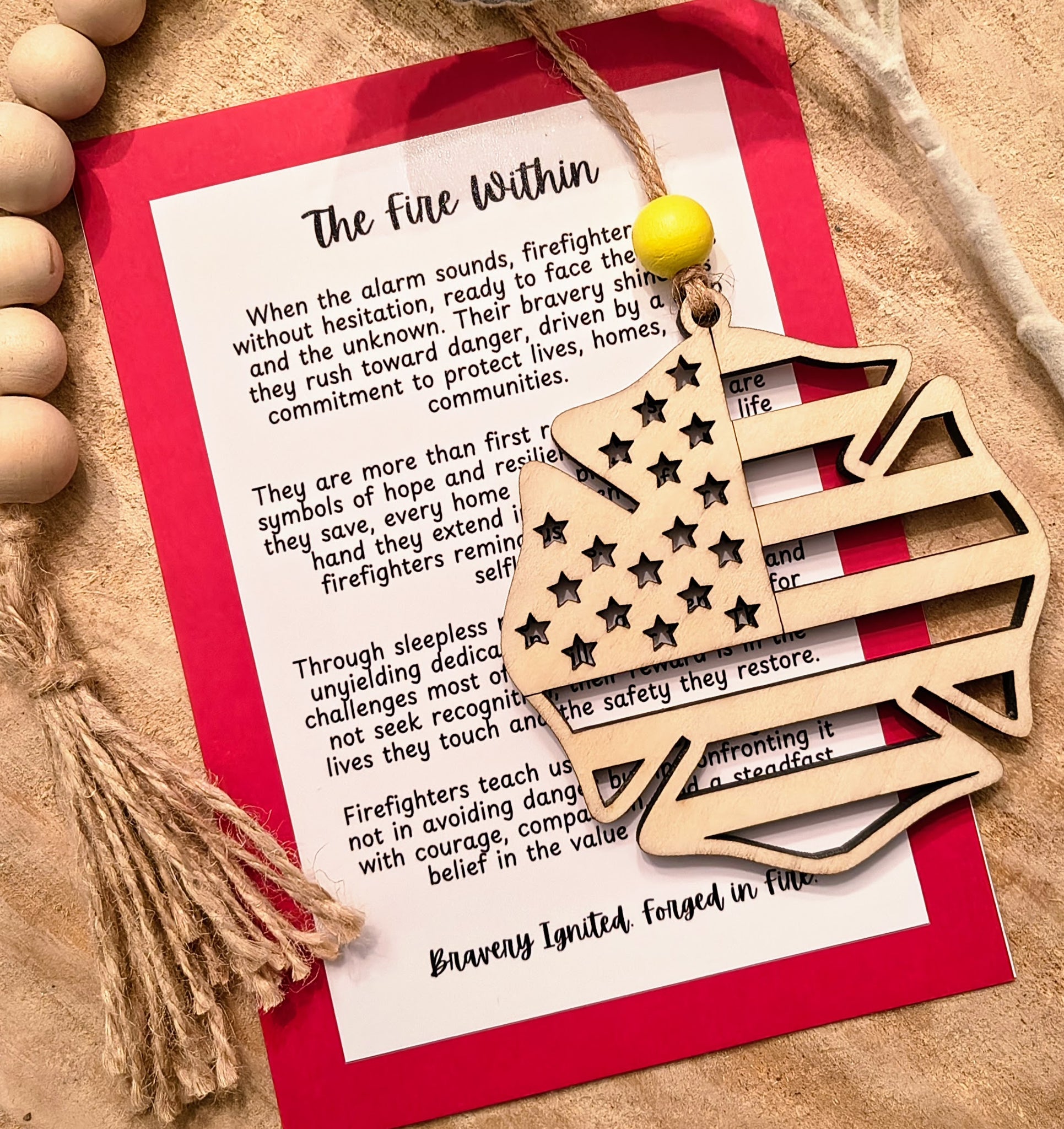 Celebrate the courage of our everyday heroes with this firefighter story charm ornament. Featuring a Maltese cross wood charm—the timeless symbol of bravery, protection, and honor—this ornament pays tribute to those who run toward danger when others run away.